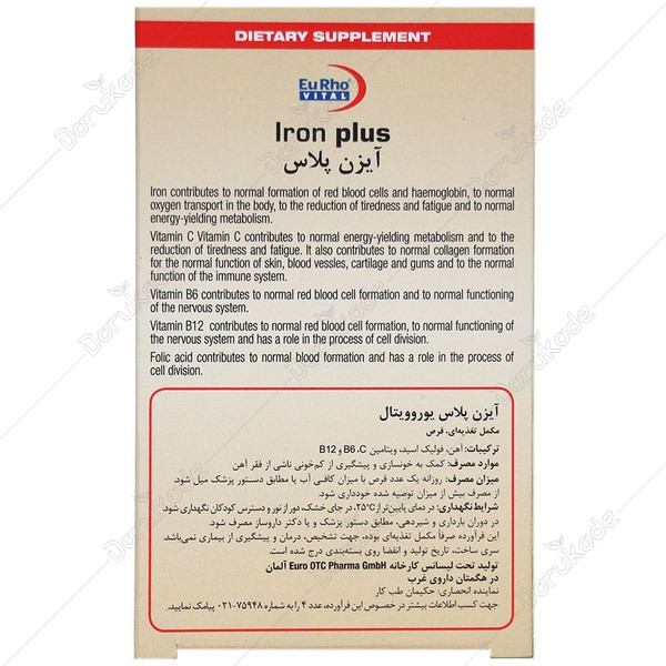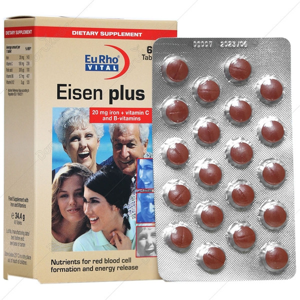 قرص Eisen plus، مکمل تغذیهای حاوی آهن به فرم فروس فومارات، فولیک اسید، ویتامین C، ویتامین B6 و B12 است. هر قرص آیزن پلاس یوروویتال 20 میلیگرم آهن المنتال فراهم میکند و برای افراد در معرض کمبود آهن، خانمها در دوران قاعدگی و همچنین افراد گیاه خوار مناسب است.