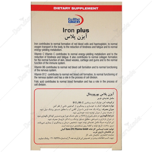 قرص Eisen plus یک مکمل آهن با ترکیبی متعادل از آهن به فرم فومارات، فولیک اسید، ویتامین C، ویتامین B6 وB12 می باشد. هر یک قرص آیزن پلاس یوروویتال حاوی 20 میلی گرم آهن المنتال (آهن قابل جذب از دستگاه گوارش) می باشد. این مکمل با فراهم نمودن آهن مورد نیاز بدن در کنار ویتامین های ضروری برای ساخت گلبول های قرمز خون، فرآیند خونسازی را در بدن تقویت می کند. آیزن پلاس با کم خونی ناشی از فقر آهن و یا کمبود فولیک اسید مقابله می کند، اکسیژن رسانی به بافت ها را تقویت می کند و به عملکرد نرمال سیستم ایمنی و سیستم عصبی کمک می کند. قرص ایزن پلاس علائم ناشی از کمبود آهن از جمله رنگ پریدگی، احساس خستگی و ضعف، سرد شدن دست و پاها، گزگز اندام ها و شکننده شدن ناخن ها را برطرف می کند. قرص آهن ایزن پلاس برای افرادی که در معرض کمبود آهن هستند، علی الخصوص خانم ها در دوران قاعدگی و همچنین افراد گیاه خوار مناسب می باشد. آیزن پلاس یوروویتال به شکل قرص های کوچک طراحی شده است، بنابراین، در افرادی که با فرآورده های آهن به فرم کپسول دچار عارضه گوارشی می شوند و یا بلع کپسول های بزرگ برایشان دشوار می باشد، انتخاب بسیار مناسبی خواهد بود. قرص آیزن پلاس یوروویتال تحت لیسانس کمپانیEuro OTC Pharma GmbH و در شرکت هگمتان داروی غرب ایران تولید می شود. ایزن پلاس در جعبه های 60 عددی به بازار عرضه می گردد.