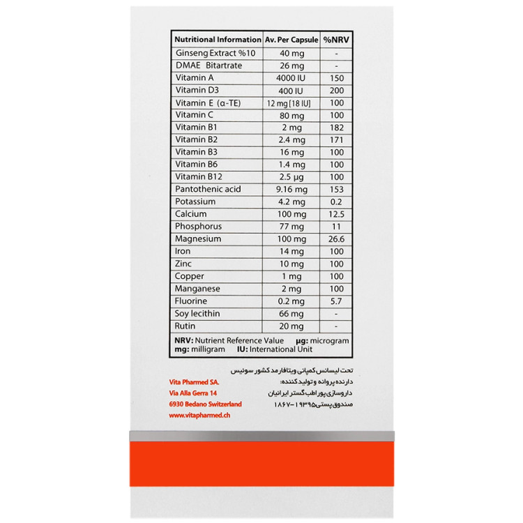 مولتیویتامین-مینرال حاوی ویتامینها، مواد معدنی، جینسینگ، لسیتین سویا و روتین