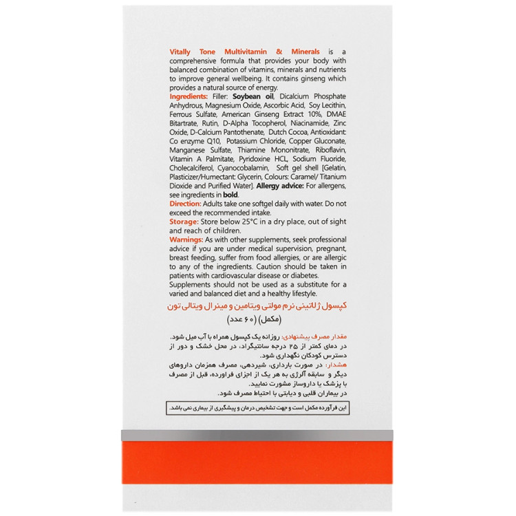 مولتی ویتامین ویتالی تون با دارا بودن ویتامین ها، مواد معدنی و ترکیباتی مانند لسیتین سویا و جینسینگ در بهبود سلامت عمومی بدن، کاهش خستگی و افزایش تمرکز موثر است.
