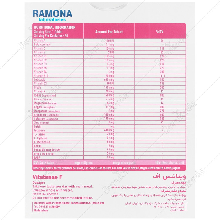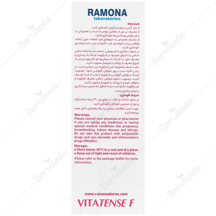 ویتاتنس اف که جهت استفاده بانوان فرموله شده است، توسط شرکت رامونا دارو در ایران تولید می شود.