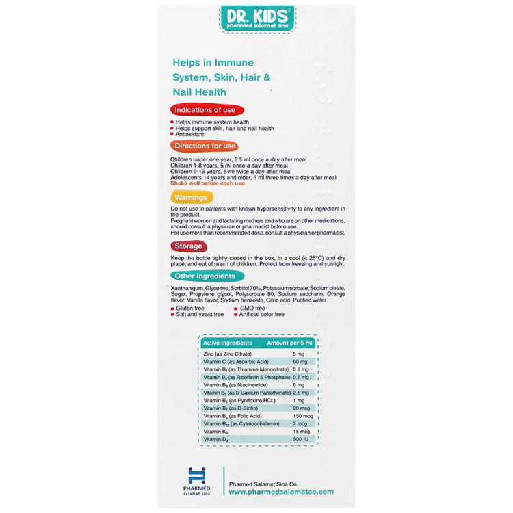 شربت دکتر کیدز شامل زینک، ویتامینهای B کمپلکس، ویتامین D3 ،C و K2 است.