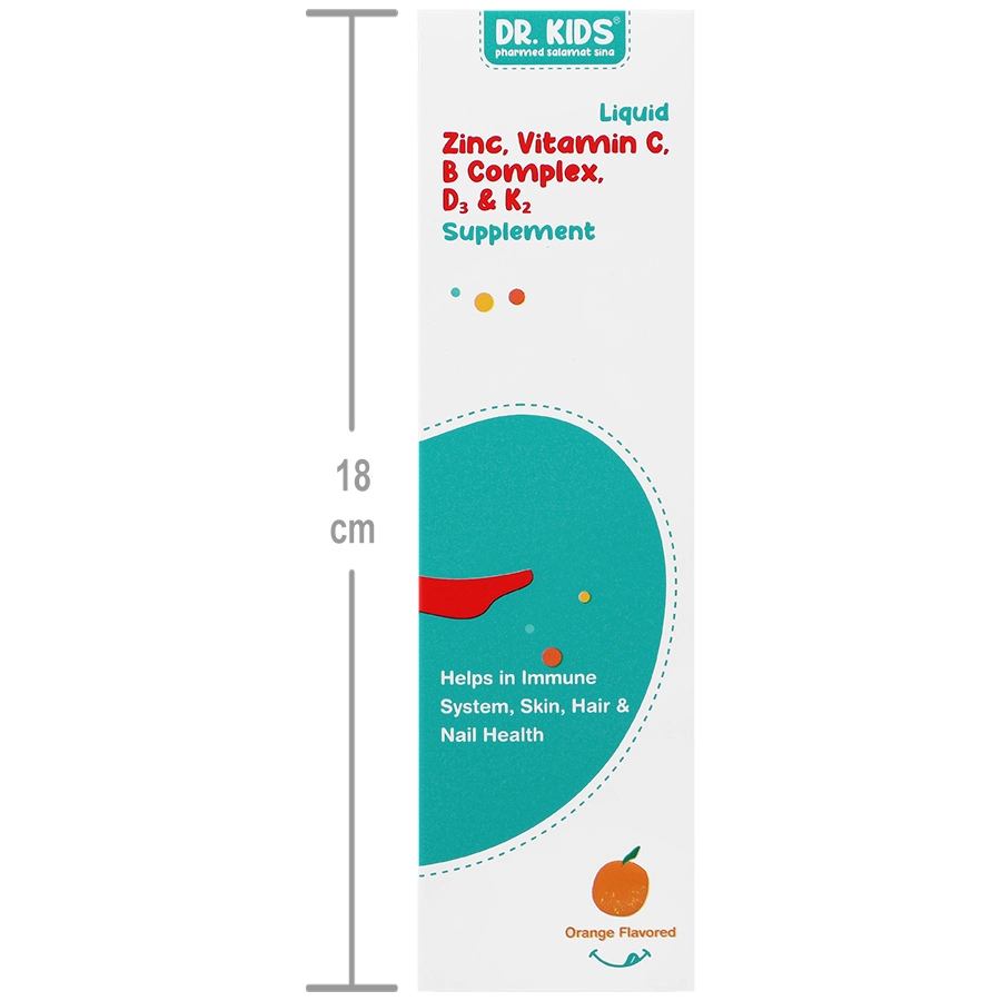 شربت دکتر کیدز شامل زینک، ویتامینهای B کمپلکس، ویتامین D3 ،C و K2 است.