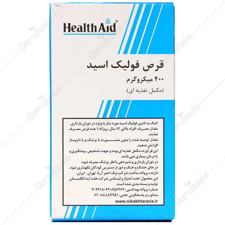 اسید فولیک هلث اید تحت لیسانس و امتیاز شرکت داروسازی هلث اید انگلستان با پروانه ساخت شرکت نیک اختر آریا تولید و در بسته بندی های 90 عددی به عرضه میرسد. فولیک اسید ۴۰۰ به تولید طبیعی گلبولهای قرمز خون، حفظ سلامت سیستم عصبی و جلوگیری از نقصهای مادرزادی مانند نقص لوله عصبی در جنین کمک میکند.