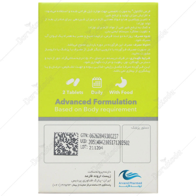 به منظور نتیجه بهتر روزانه 2 قرص شیر افزا لاکتاول (صبح و عصر) به همراه یک لیوان آب توسط مادر مصرف شود.