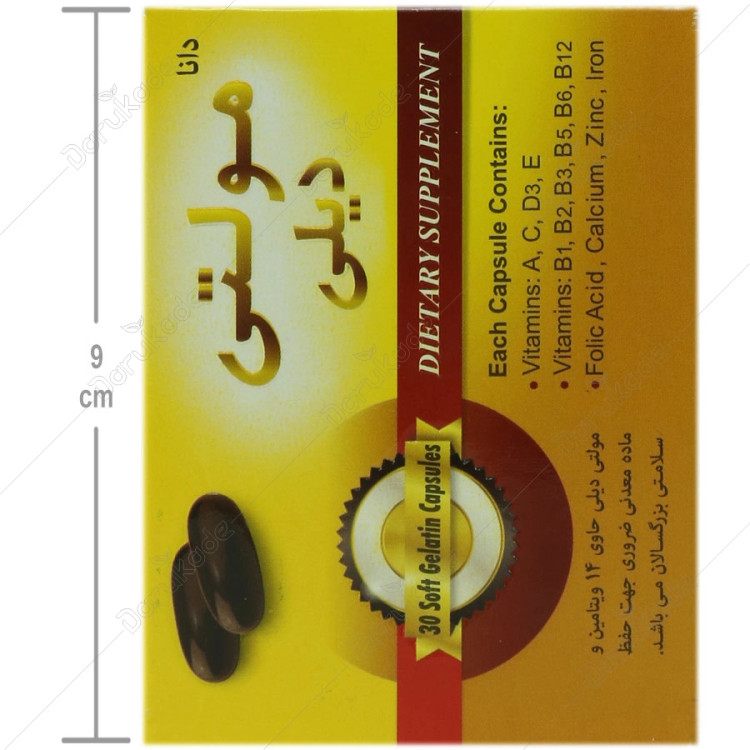 مولتی ویتامین دانا بهفرم دارویی سافت ژل در جعبه مقوایی 30 عددی حاوی 3 بلیستر 10 تایی توسط شرکت داروسازی دانا در ایران تولید و عرضه میشود.