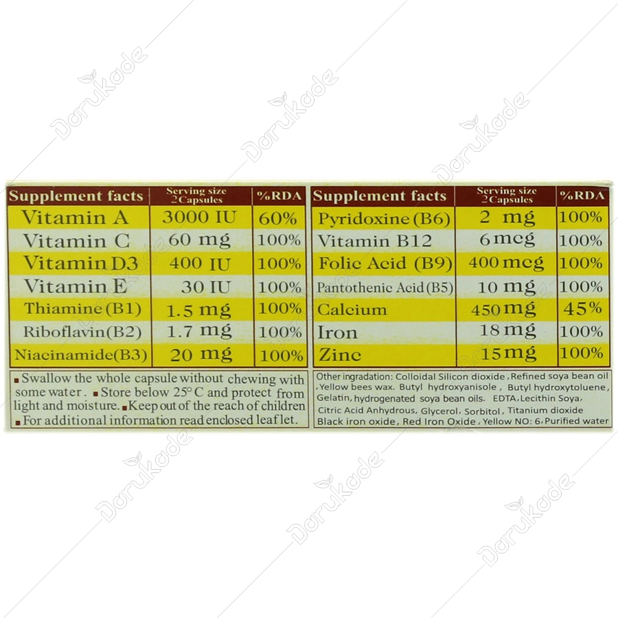 این مکمل همچنین حاوی ویتامین C و زینک برای تقویت سیستم ایمنی بدن، آهن برای پیشگیری از کمخونی، به ویژه در بانوان، و انواع ویتامینهای گروه B جهت تولید انرژی و حفظ سلامت عمومی بدن است.