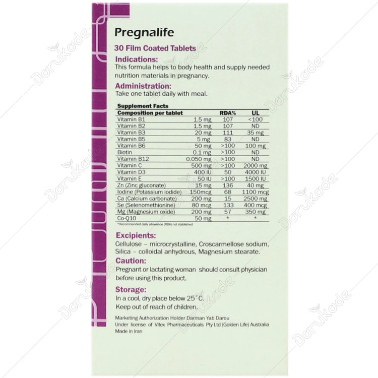قرص پرگنالایف با تامین مقادیر کافی از انواع متنوعی از ریزمغذیهای لازم برای مادر باردار و جنین از با کیفیت ترین مکملهای بارداری موجود در بازار است که تحت برند شرکت گلدن لایف استرالیا و توسط شرکت درمان یاب دارو در قالب قوطی حاوی سی عدد قرص تولید و بسته بندی میشود.