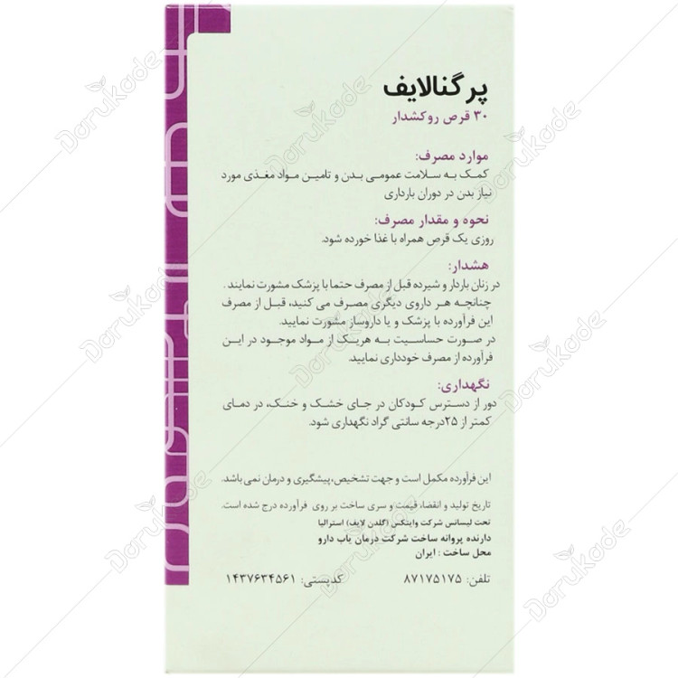 پرگنالایف مولتی ویتامین مینرال بارداری مناسب استفاده به مدت 30 روز می باشد.