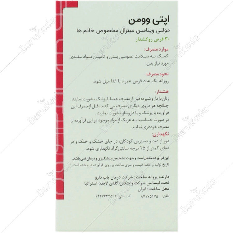 اپتی وومن تحت امتیاز و لیسانس شرکت وایتکس (گلدن لایف) استرالیا و دارنده پروانه ساخت شرکت درمان یاب دارو می باشد.