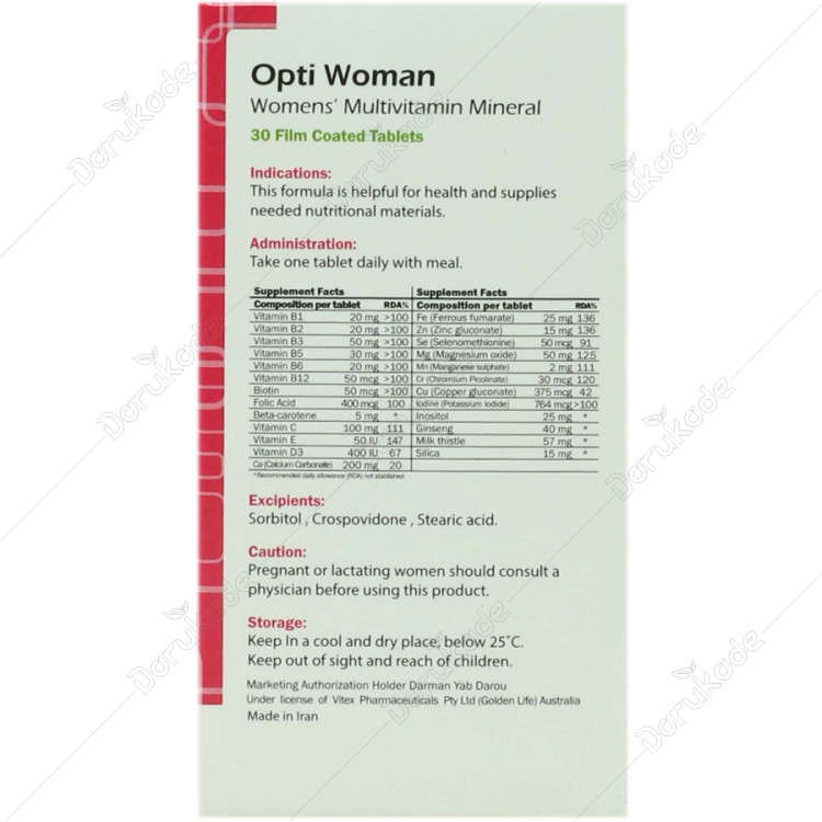 فرمولاسیون قرص opti woman برای سلامت بدن زنان را می توان به چند دسته شامل موارد زیر تقسیم نمود: