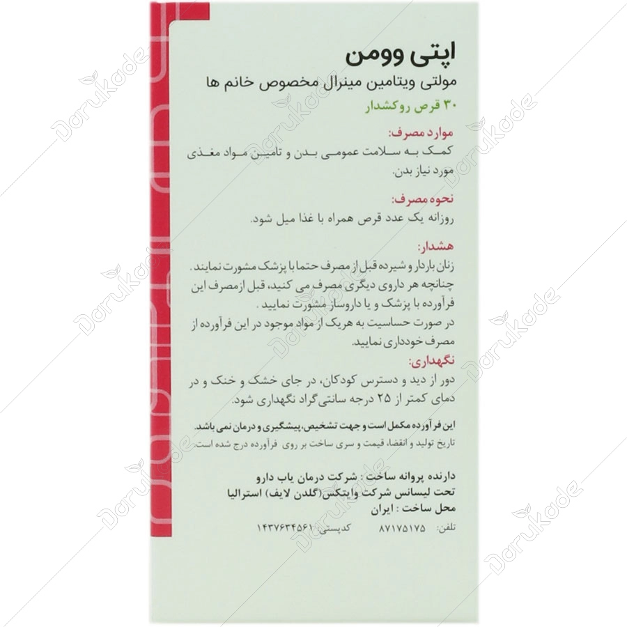 اپتی وومن تحت لیسانس شرکت وایتکس (گلدن لایف) استرالیا تولید شده و توسط شرکت درمان یاب دارو ایران (شرکت دارنده پروانه ساخت) تولید می شود. اپتی وومن با فرم دارویی قرص روکشدار، در قوطی های 60 عددی و 30 عددی عرضه شده است.