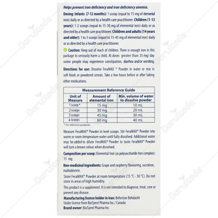 پودر آهن خوراکی feramax حاوی 15 میلی گرم آهن المنتال به فرم کمپلکس پلی ساکاریدی قابل حل در آب در هر پیمانه است.