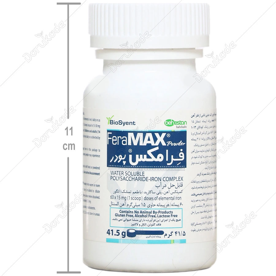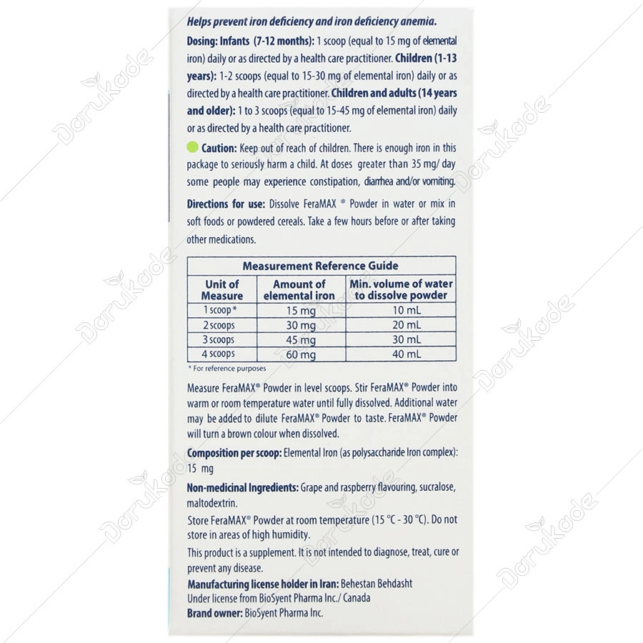 پودر آهن خوراکی feramax حاوی 15 میلی گرم آهن المنتال به فرم کمپلکس پلی ساکاریدی قابل حل در آب در هر پیمانه است.