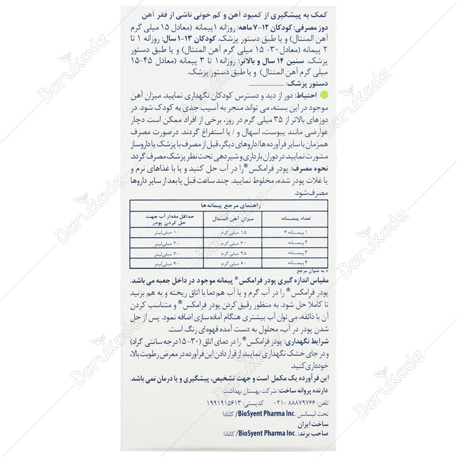 پودر فرامکس، مکمل تغذیه ای برای کمک به تأمین آهن مورد نیاز بدن و بهبود کمبود آهن است. پودر فرامکس، حاوی 15 میلی گرم آهن به فرم آهن پلی ساکاریدی محلول در آب در هر پیمانه است و در کمک به بهبود کم خونی فقر آن و عوارض ناشی از آن همچون بی حالی، خستگی، رنگ پریدگی و ریزش مو نقش دارد. پودر آهن فرامکس، بدون گلوتن، الکل و لاکتوز است و هیچ یک از اجزای این فرآورده منشا حیوانی ندارند. پودر اهن فرامکس برای کمک به پذیرش بهتر با طعم تمشک و انگور طراحی شده است. پودر فرامکس برای کودک بالای 7 ماه و بزرگسالان قابل استفاده بوده و با برند Biosyent در قوطی پلاستیکی 83 گرمی (حاوی 120 پیمانه) و 41.5 گرمی (حاوی 60 پیمانه)، تحت لیسانس Biosyent کانادا و توسط شرکت بهستان بهداشت در ایران تولید می شود.