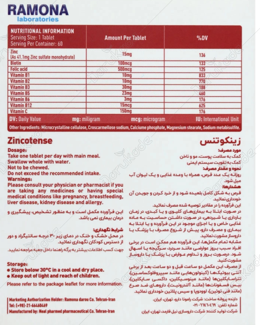 زینکوتنس یک مکمل تغذیهای پیشرفته است که با ترکیب دقیق زینک به فرم زینک سولفات منوهیدرات، مجموعهای از ویتامینهای B کمپلکس شامل بیوتین، تیامین، ریبوفلاوین، نیاسین، پانتوتنیک اسید، پیریدوکسین، فولیک اسید، سیانوکوبالامین، و همچنین ویتامین C طراحی شده است. زینکوتنس توسط شرکت رامونا دارو تحت برند رامونا تولید شده و در بلیسترهای 60 عددی عرضه میشود. این محصول برای تقویت سیستم ایمنی، حمایت از سلامت پوست، مو، و ناخن، و بهبود سلامت کلی بدن تولید شده است.